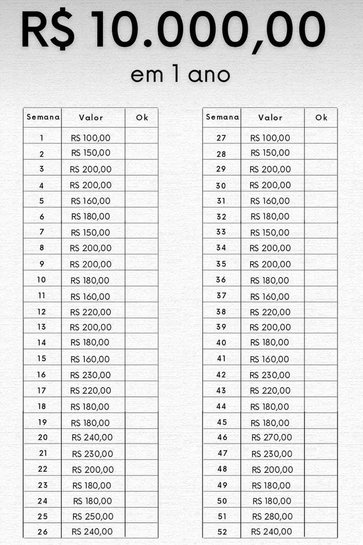 A cada semana, você fará um depósito. Os valores começam pequenos e aumentam gradativamente, o que torna o desafio mais acessível, especialmente nos primeiros meses. A tabela abaixo mostra o valor que deve ser depositado a cada semana: